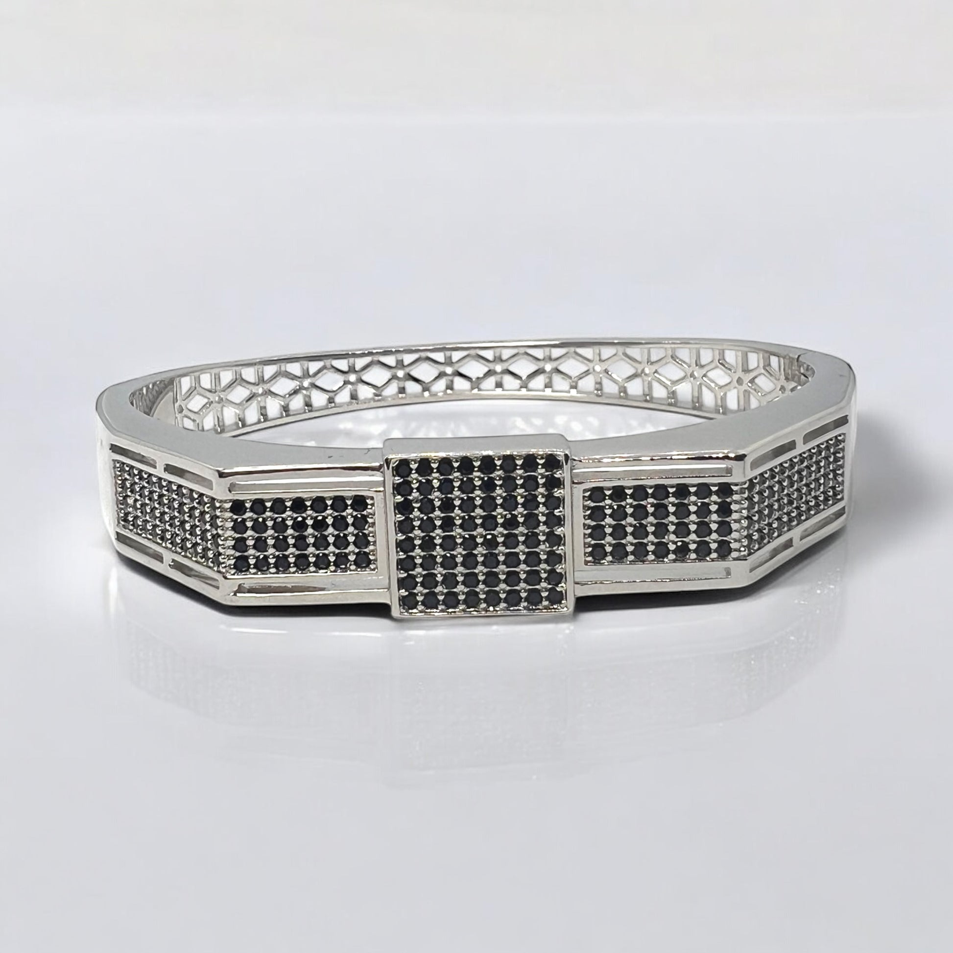 Bold. Modern. Unapologetically powerful. The Noir Grid Cuff is a distinctive unisex bracelet crafted in 925 sterling silver, featuring a striking grid of precision-set black cubic zirconia stones across its broad surface. With its structured, rectangular architecture and meticulous stonework, it exudes a balance of minimalist design and luxury appeal.