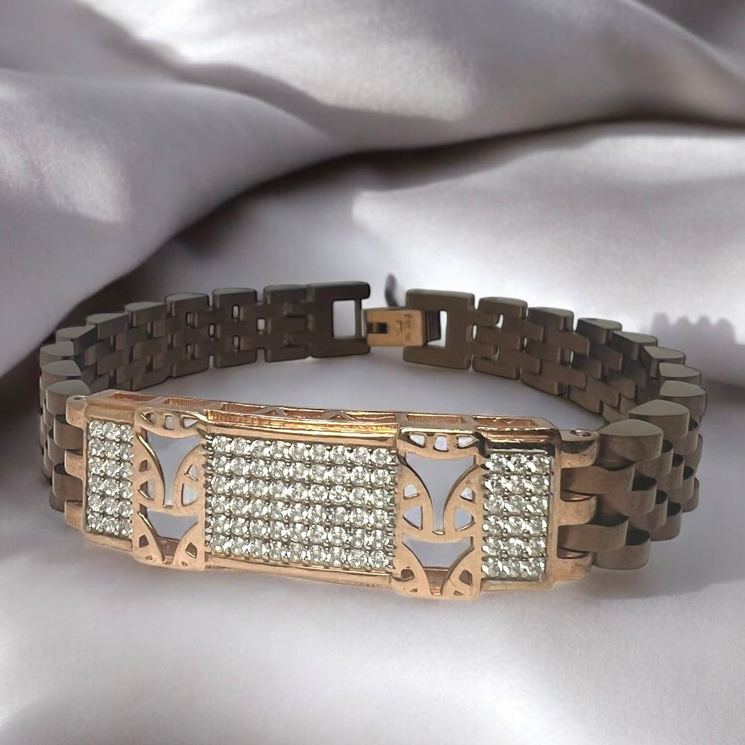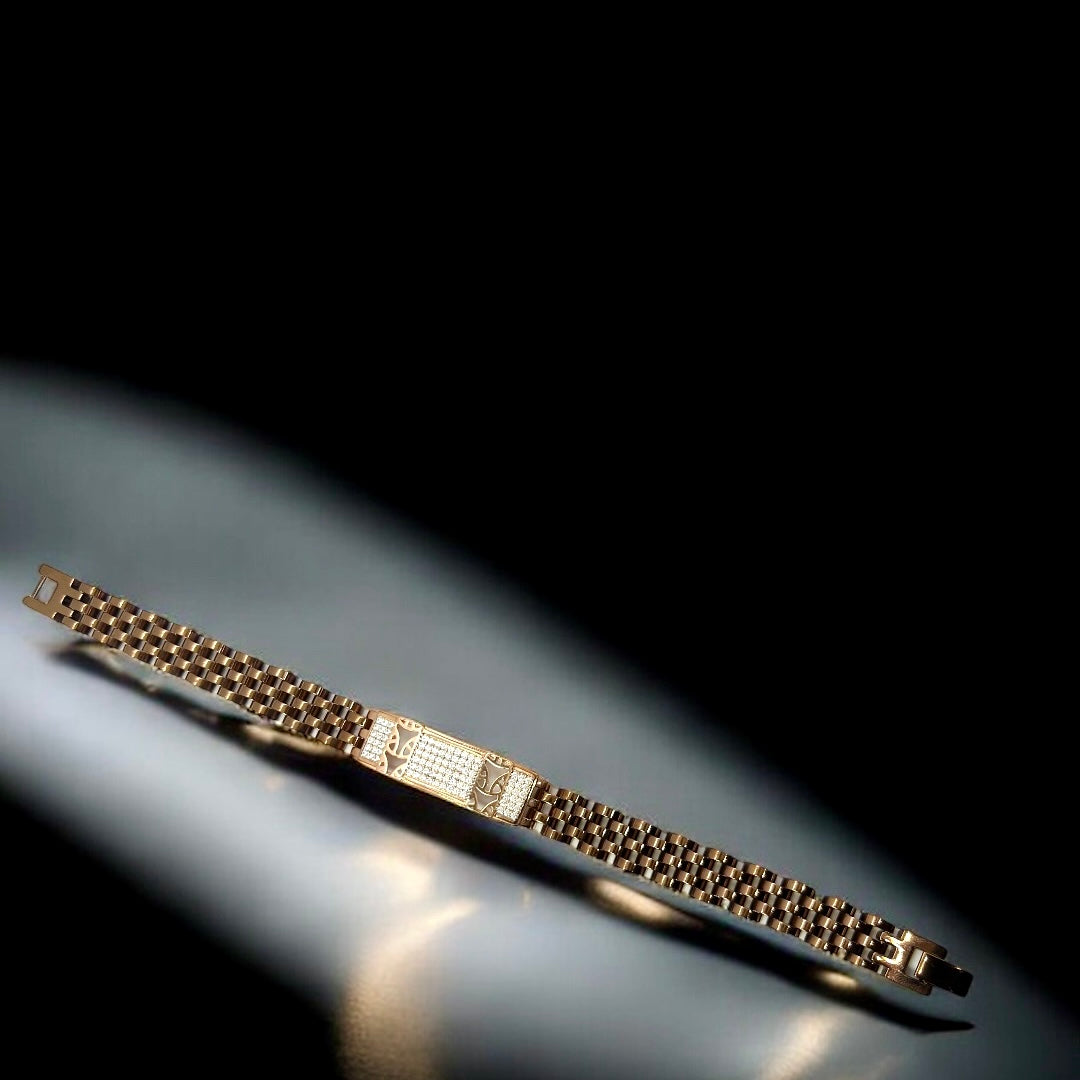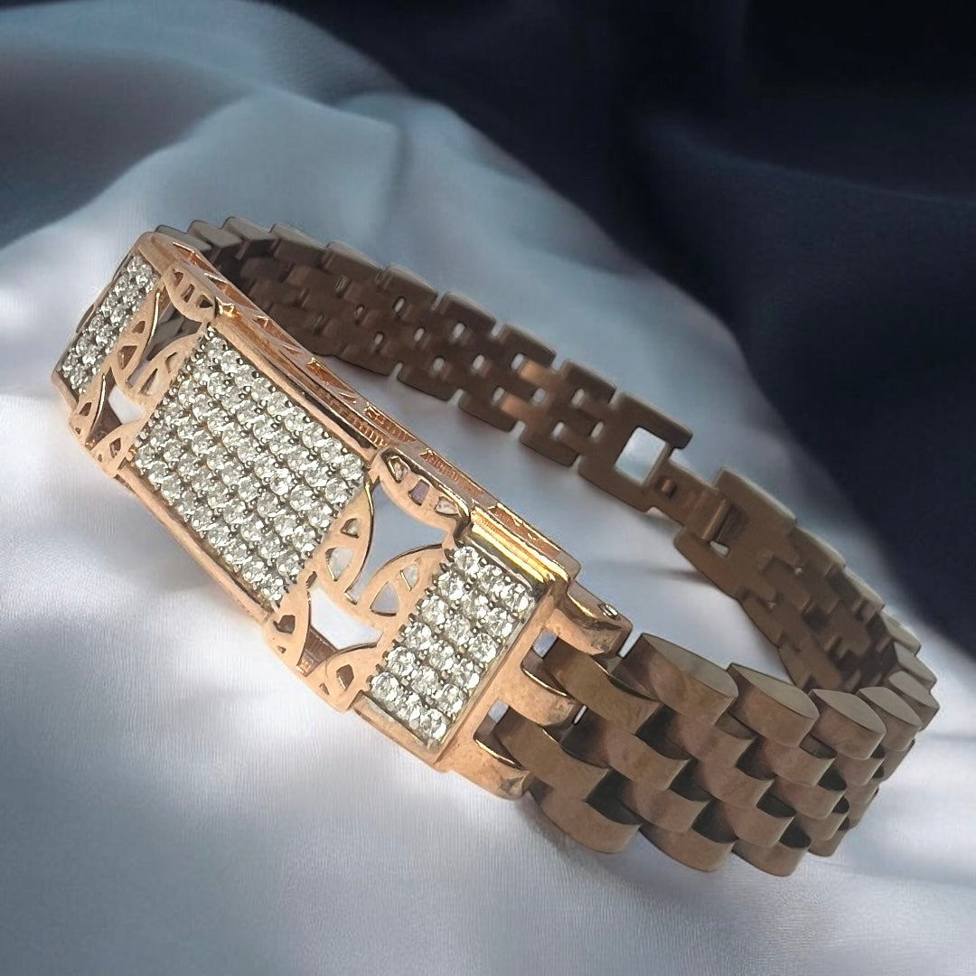 Where tradition meets fire. The Heritage Flame bracelet features bold rose-gold links and a CZ encrusted bar engraved with a striking calligraphic motif - a symbol of legacy and identity.
