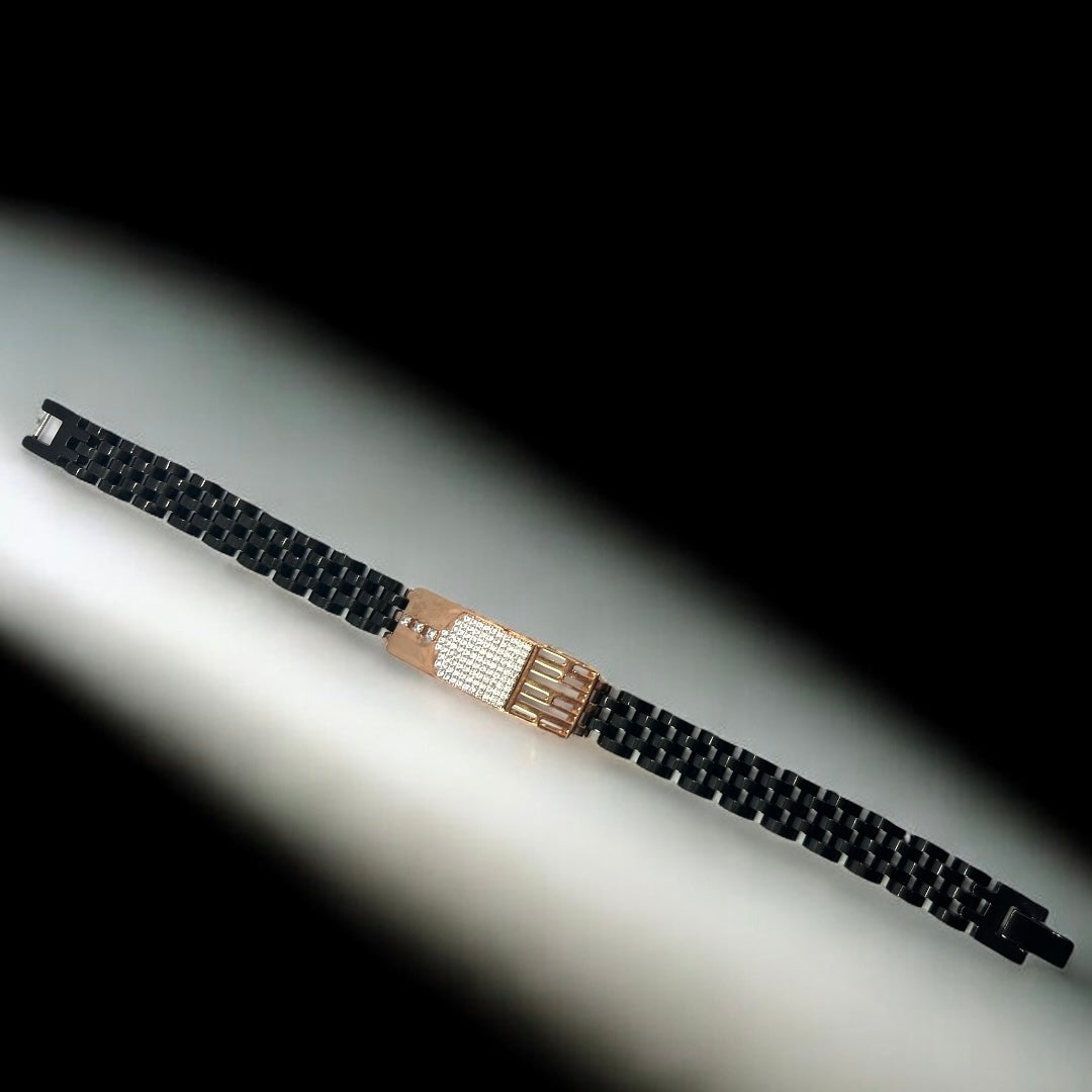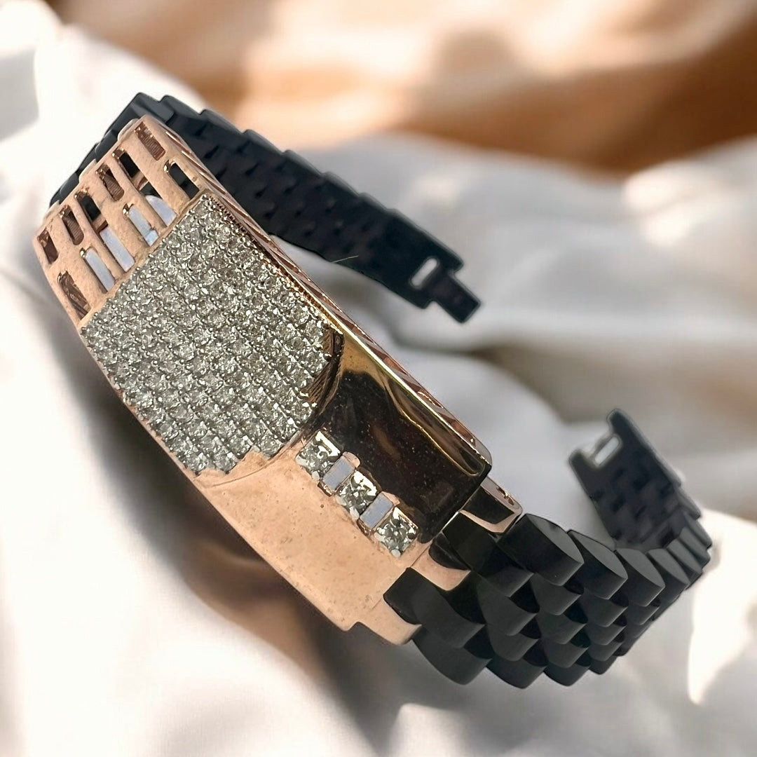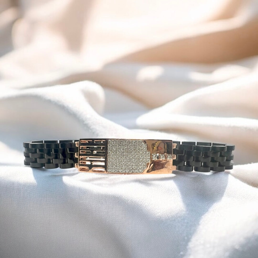 A powerful fusion of matte black links and rose gold brilliance, the Obsidian Grid commands attention. Its cage-style gridwork centerpiece, pavé-set with CZ stones, mirrors the strength and precision of modern architecture.